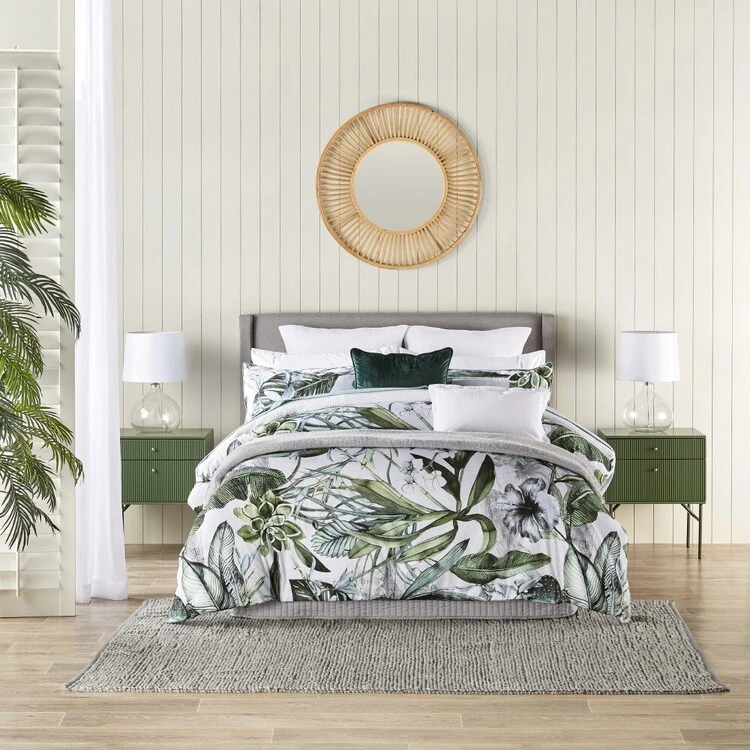 Turn your bedroom into a gorgeous and luscious oasis this season with the Jane Lamerton Oasis Cotton Quilt Cover Set. Featuring an overlapping exotic floral design in vibrant forest green highlighted with stunning light teal hues over a bright white base, this quilt will ensure that your bedroom is your own little getaway paradise at home. Elevate your home with the Jane Lamerton bedding range at Harris Scarfe today.