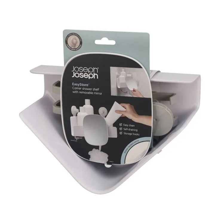 The Joseph Joseph Easystore Corner Shower Caddy takes the hassle out of shower storage. It�s large enough to hold all your soap and shampoo bottles and features hooks for razors, sponges and flannels and a hinged, removable, shatter-resistant acrylic mirror. The shelf lifts off the fixing brackets, making it very easy to clean, and it�s quick and simple to install using the powerful, super-grip suction cups. This also means it�s fully repositionable without damaging your wall or tiles. Shop the Joseph Joseph range at Harris Scarfe today!