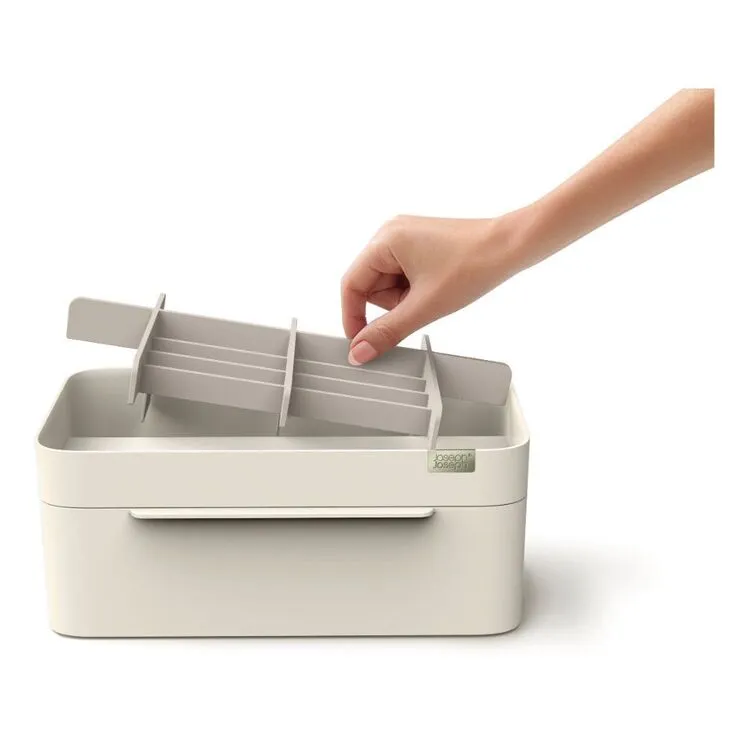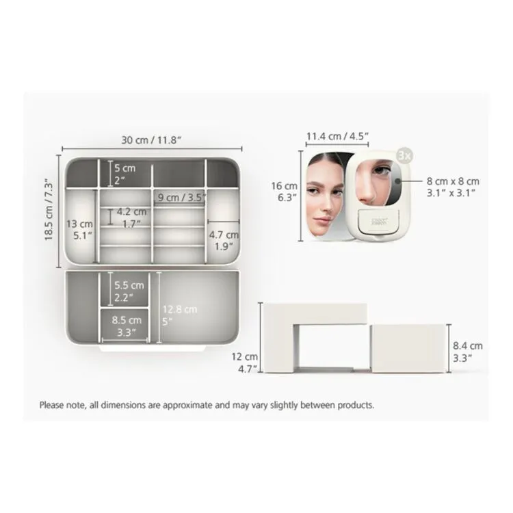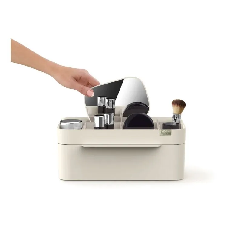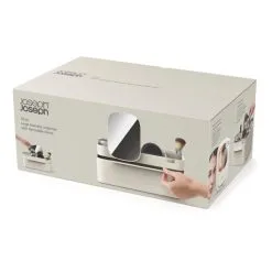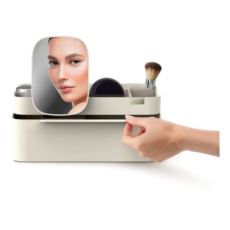Organise your space with the Joseph Joseph Viva Large Cosmetic Organiser With Removable Mirror – Shell. Featuring a combination of shallow and deep compartments as well as an easy to pull drawer, this organiser can store a variety of different products! This all-in-one cosmetic organiser also features a removable 2-in-1 mirror that can be stored in a slot at the back or mounted onto the edge of the organiser for a convenient, hands-free use! The angle of the mirror can be easily adjusted and it features a 3x magnification mirror on the reverse, for helping with finer detail. In a stunning neutral colour tone, this organiser will be a calming addition to your bedroom, dressing room or bathroom!