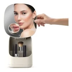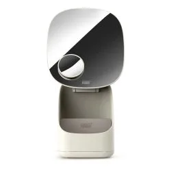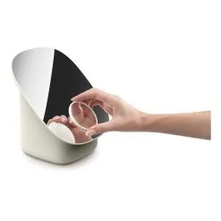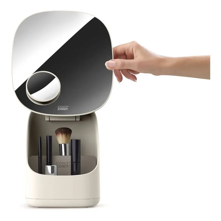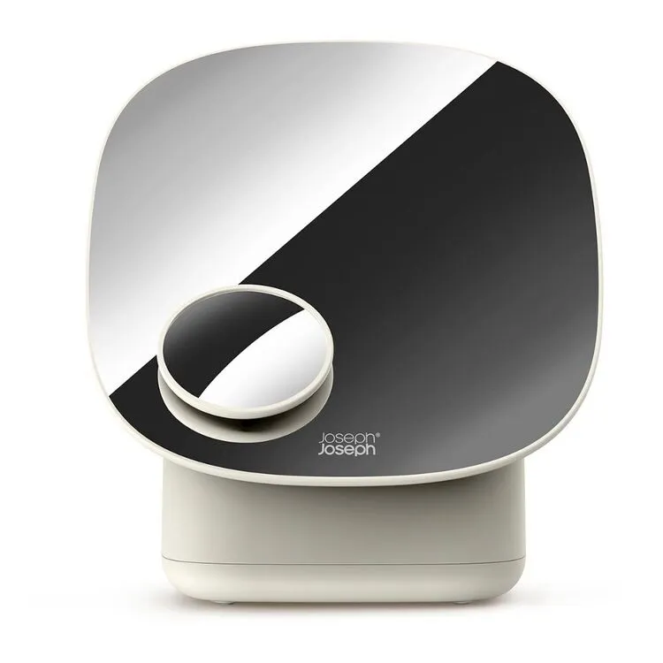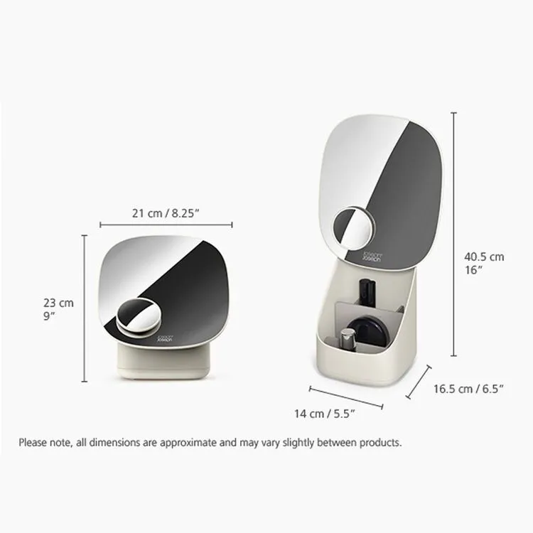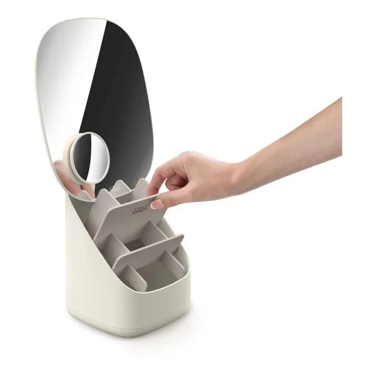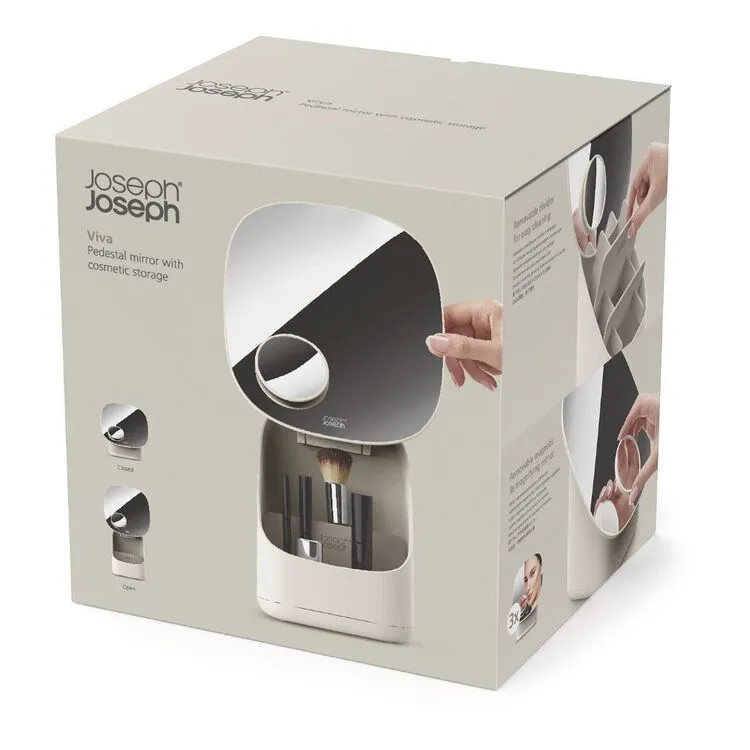 This stylishly designed Viva Pedestal Mirror With Cosmetic Organiser from Joseph Joseph combines various make-up necessities in one compact unit. It features a large mirror that showcases a wider view of your face and neck, as well as a smaller 3x magnifying mirror for finer, detailed work. The magnifying mirror has a magnetic back with a soft finish so it can be stored on the main mirror without scratching and can be removed for ease of use. The main mirror reveals a handy compartment inside the stand when lifted, providing organised storage for a range of cosmetics and accessories.