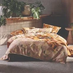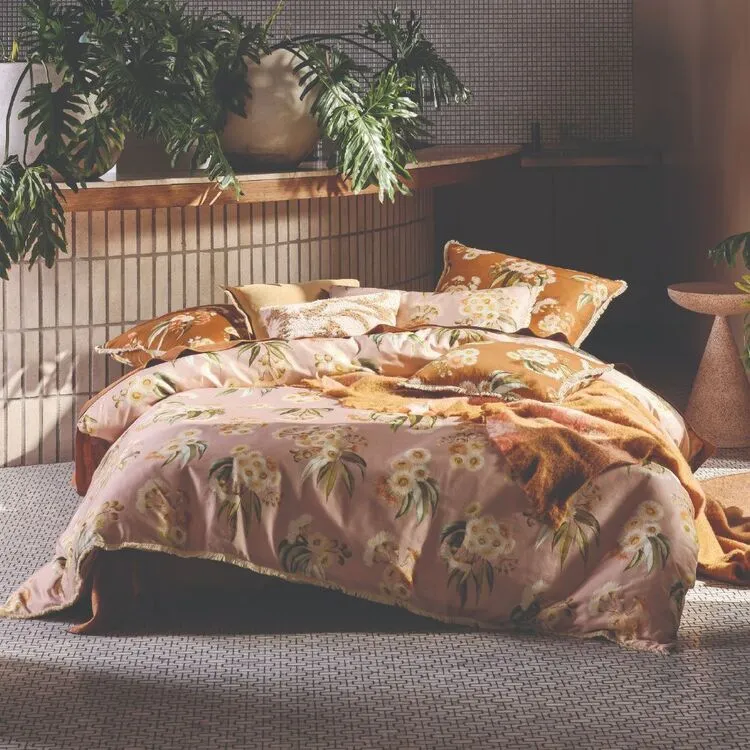 The Olli Cotton Quilt Cover Set by Linen House brings Australiana beauty to your bedroom. The iconic flowering-gum blossom is painted in warm natural tones that stand out against a soft dusty-pink cotton sateen background. Complimented by coordinating European pillowcases and cushion with cotton fringing, this quilt cover set is perfect for a soft, cosy touch.