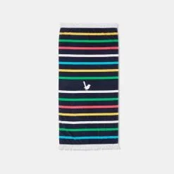 Embrace the joy of colour in your summer looks with the Mozi Stripes Velour Beach Towel. This funky choice features green, yellow, red, white and blue stripes on a contrasting navy background. Printed on a 2 ply 100% combed cotton velour construction with attached white fringing, you’ll be comfortably lounging in style at the poolside or beach. Explore the full range of groovy beach towel prints, in-store or online at Harris Scarfe today.