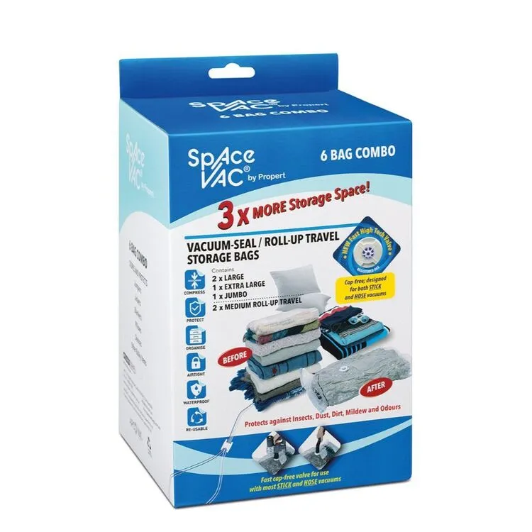 Crafted from a water proof and durable multi layer polymer, this versatile Space Vac Combo Bag x 6 will keep you clothes, bed linen, and more safe, secure, and organised. It includes 1 jumbo, 2 large, 1 extra-large and 2 travel sized bags, designed to compress, protect and organise a wide range of household objects. Designed to be compatible with 99% of vacuums, letting you compress, protect and organise with ease.