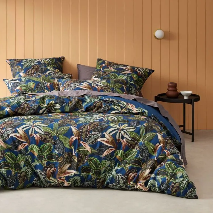 Spice up your bedroom decor and transport yourself to a tropical wonderland with the Warwick Home Zanzibar Quilt Cover Set! This luxurious quilt cover set features a whole array of luscious plants printed in a rich mix of forest green, pine, walnut brown and lapis blue hues. It will add bold character that speaks of warm summer adventures, admire the beauty of natural rainforests by pairing this set with earthy coloured European pillows and home decor pieces.